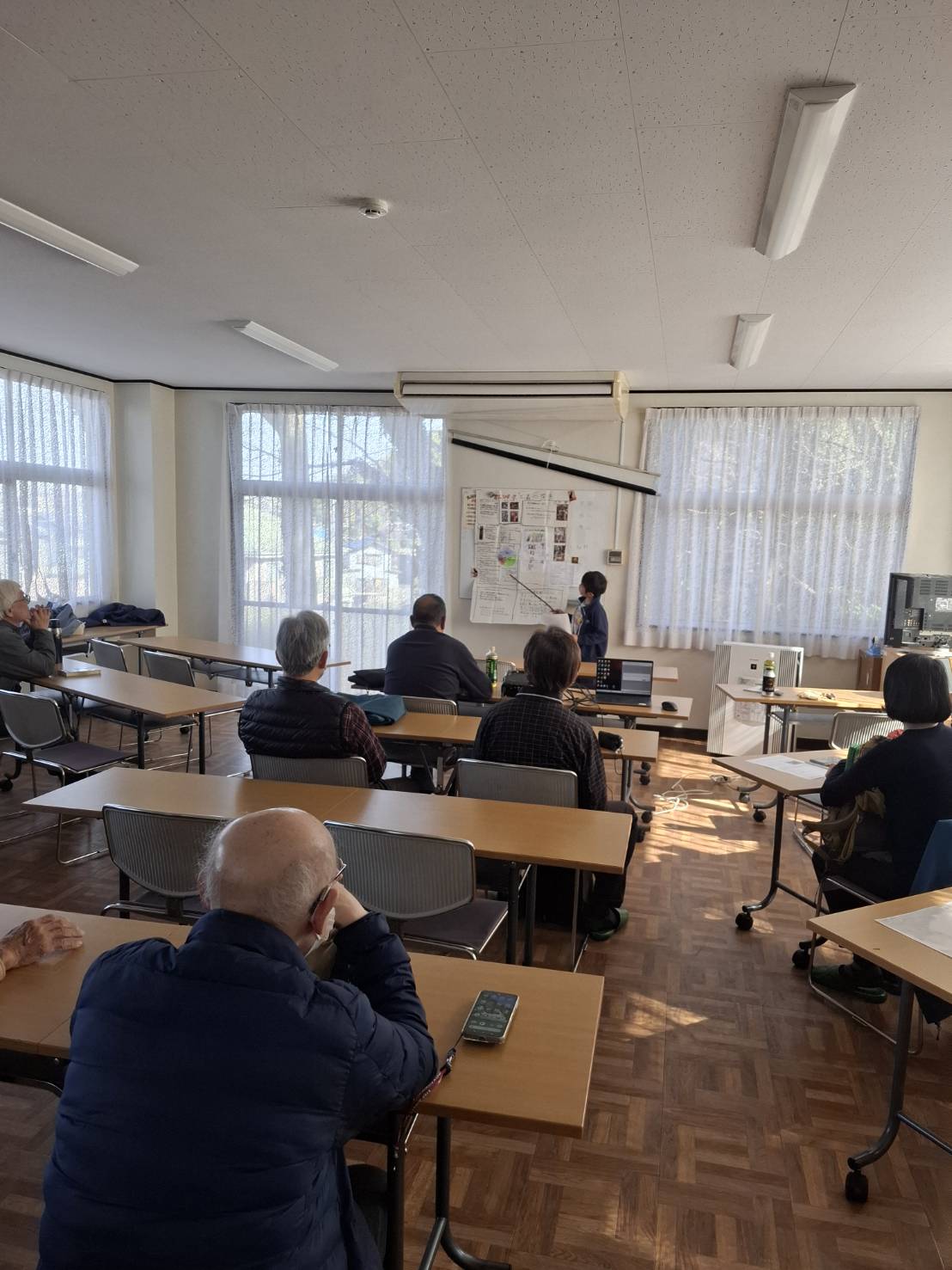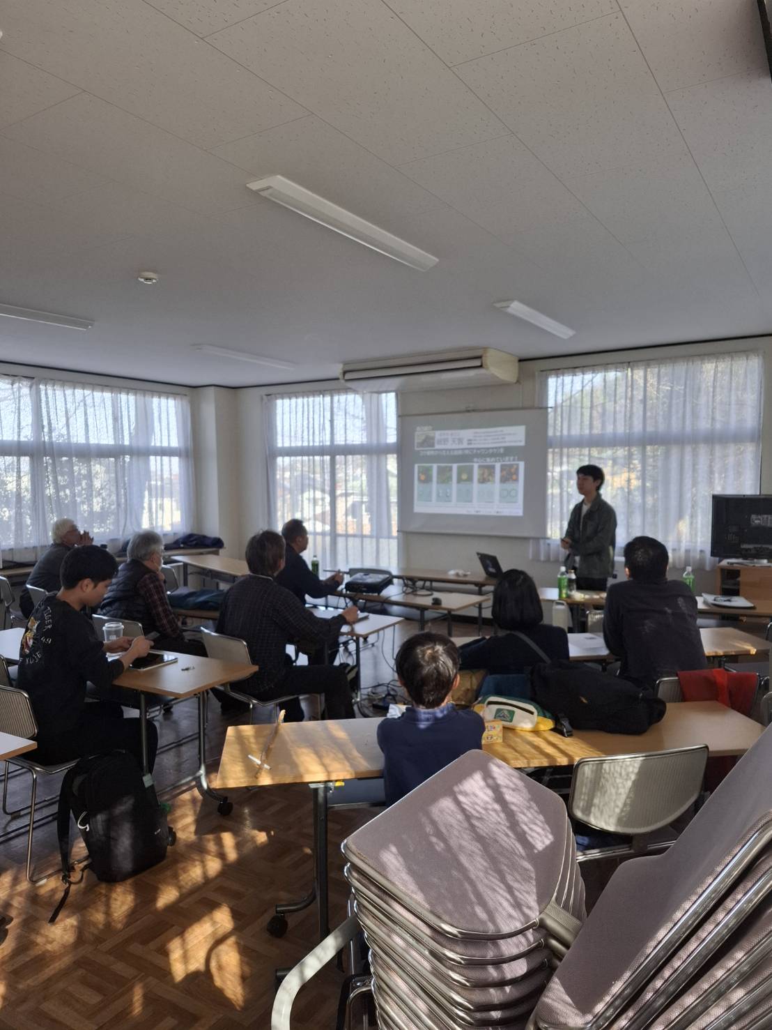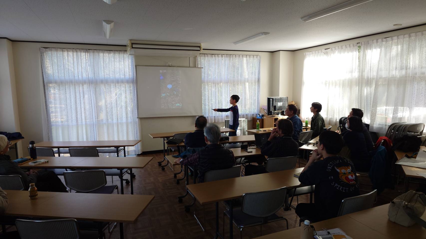 写真による勉強会の報告 参加者演者含めて14名 最初に小学5年生のO君のポスターによるカエンタケの研究の発表。 よく研究されていて色々人に取材して素晴らしい発表でした。 次に6年生のY君発表。 色々なフィールドで出会ったキノコをスライド形式で発表してくれました。 次に特別講師としてお招きした H先生の 『コケ植物生菌の世界 〜 日本で見つかり始めたコケと生きるキノコたち』題して 興味深い話しをうかがいました。 初めての苔の中のキノコの話で全員釘付けでした。 会が終わり先生と数名で公園の苔を探しに行きましたが見つからず、 フィールドでの見方が少し変わるかもしれません